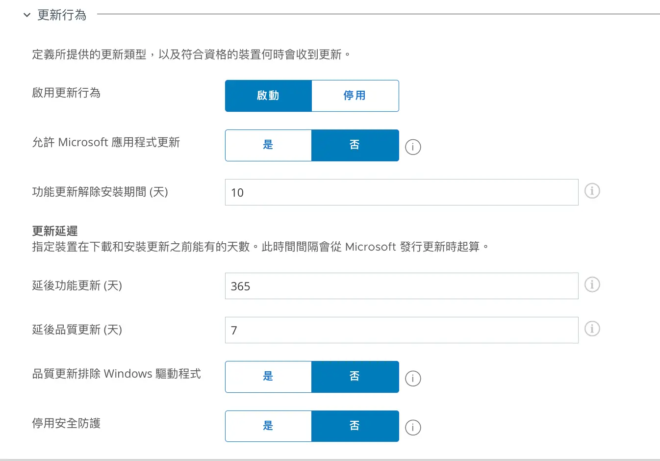 - 延後功能更新:最多可延後 365 天,避免太快升級大版本。